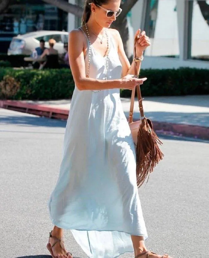 淡蓝色的吊带连衣裙简约清新、轻盈舒适,属于夏日清凉必备了