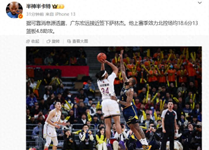 传来了广东宏远男篮的重磅消息,朱芳雨接近签下萨林杰