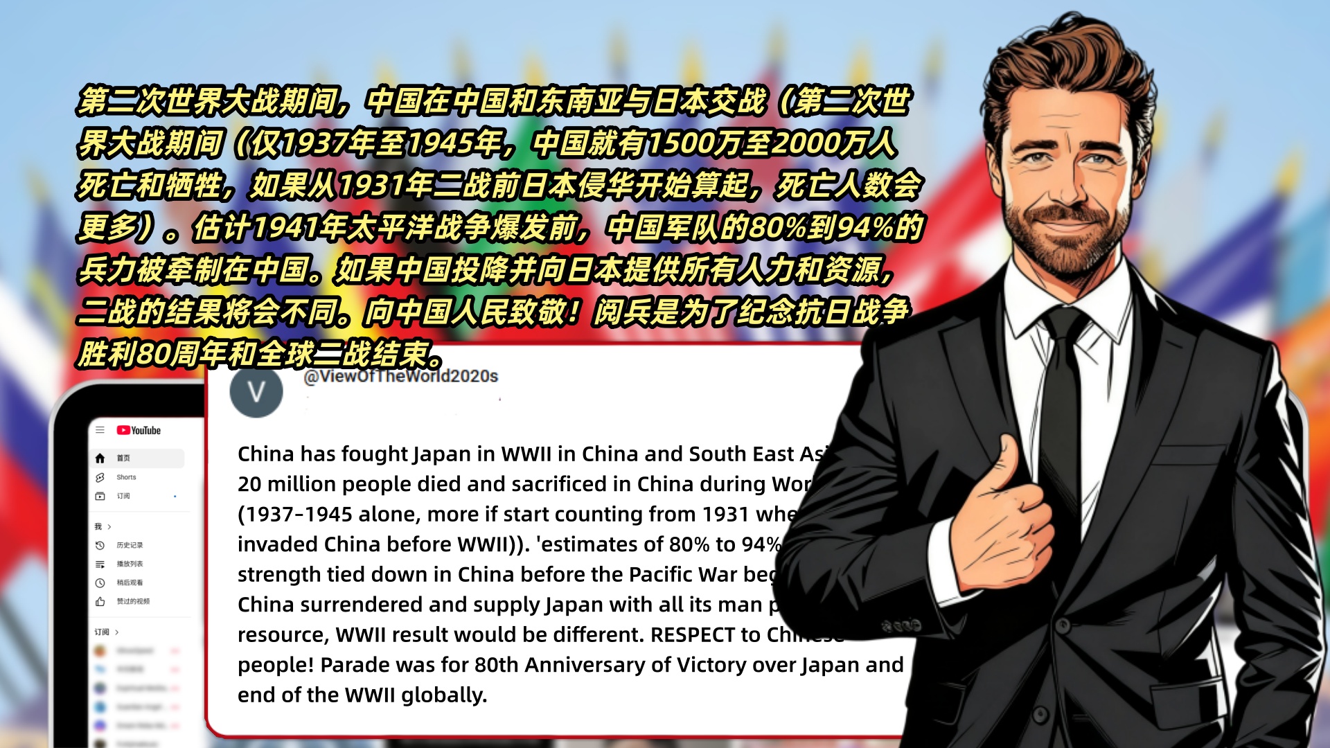 网友ViewofTheWorld2020s对中国人表示致敬:“第二次世界大战期间,中国在中国和东南亚与日本交战(第二次世界大战期间(仅1937年至1945年,中国就有1500万至2000万人死亡和牺牲,如果从1931年二战前日本侵华开始算起,死亡人数会更多)。估计1941年太平洋战争爆发前,中国军队的80%到94%的兵力被牵制在中国。如果中国投降并向日本提供所有人力和资源,二战的结果将会不同。向中国人民致敬!阅兵是为了纪念抗日战争胜利80周年和全球二战结束。”