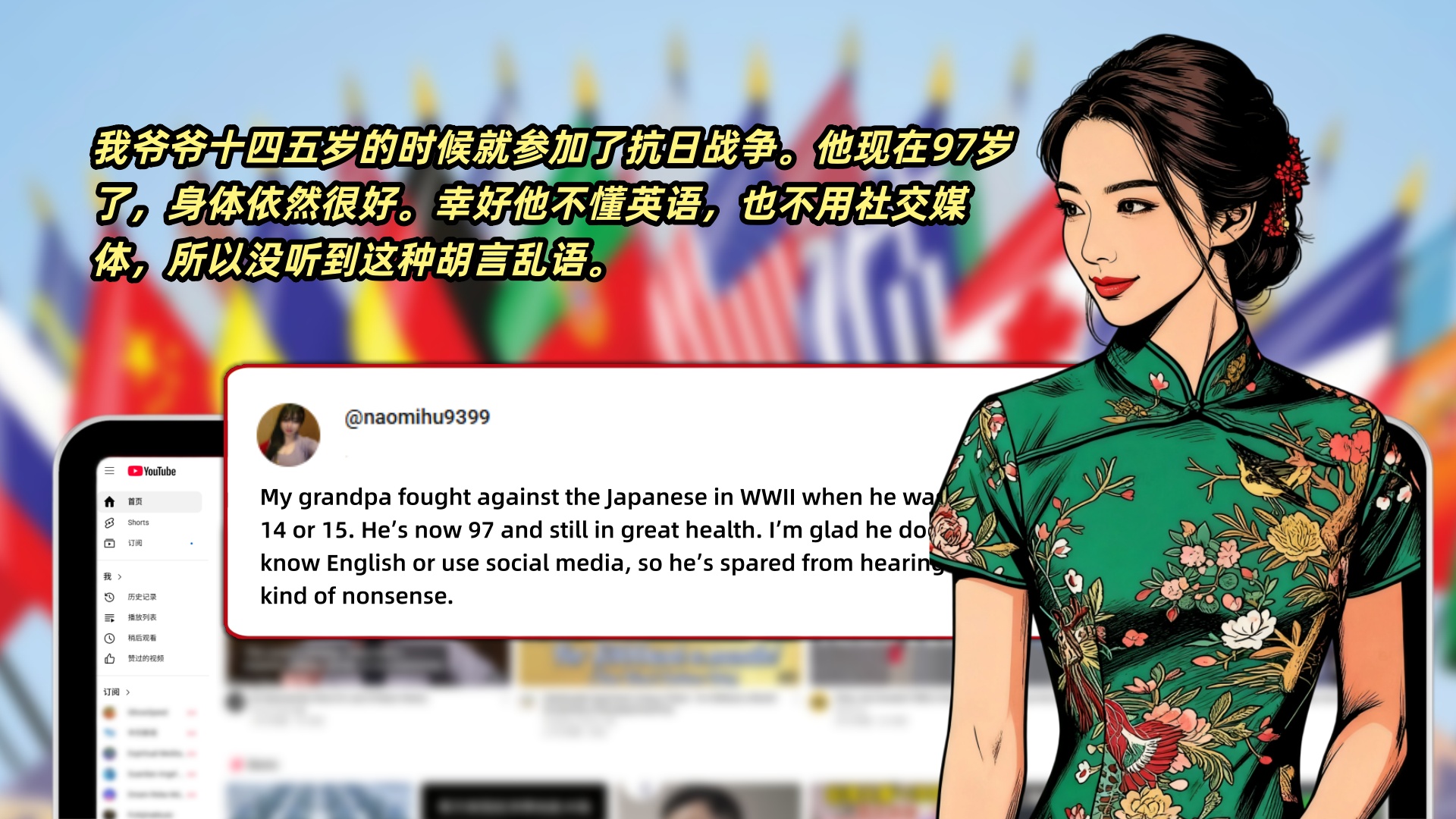 中国网友naomihu9399说道:“我爷爷十四五岁的时候就参加了抗日战争。他现在97岁了,身体依然很好。幸好他不懂英语,也不用社交媒体,所以没听到这种胡言乱语。”