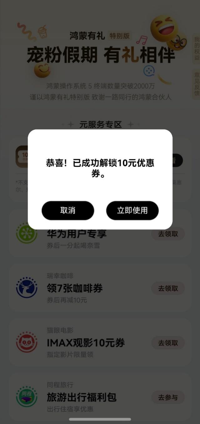 我今天就领了一张优惠券,在奈雪点单元服务给自己点了一杯华为专享的“奈雪茉莉初雪”,直接抵扣10元,相当于只花了0.01元,这波薅羊毛真是让喝到嘴里的奶茶都更甜了。各位假期归来的伙伴们,也别忘了看下自己的鸿蒙5手机里的鸿蒙有礼活动,抓住这个福利的尾巴,看看开工前还有什么羊毛可以薅,给自己的开工日加个油!