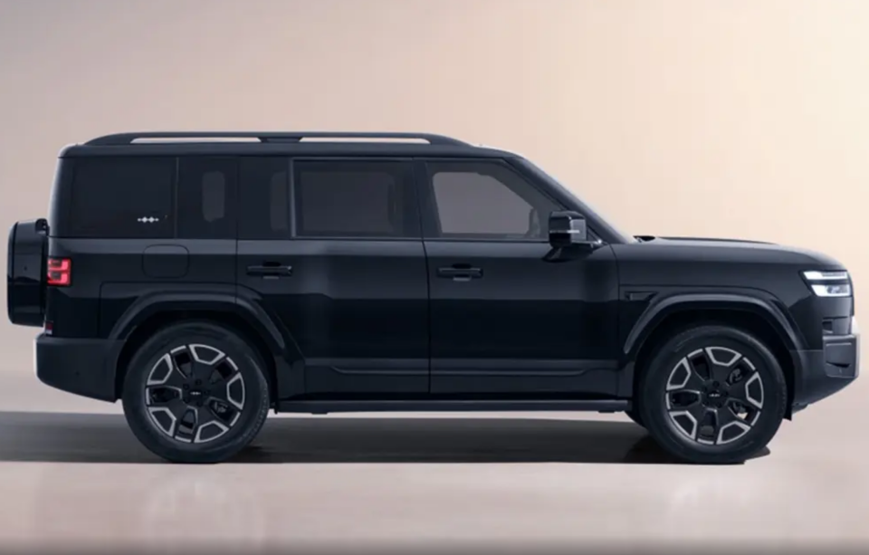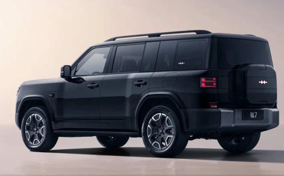 车身侧面,平直的车顶线条与车窗轮廓相呼应,车身同色轮眉、方形外后视镜以及 D 柱位置的方程豹品牌标识,都彰显着独特的个性。值得一提的是,钛 7 配备了传统门把手,在保证实用性的同时,也暗示了其更偏向城市使用的定位。车尾部分,竖向布局的双 L 型尾灯组搭配外挂式储物箱和侧开式尾门,不仅硬派感十足,还具有较高的辨识度。