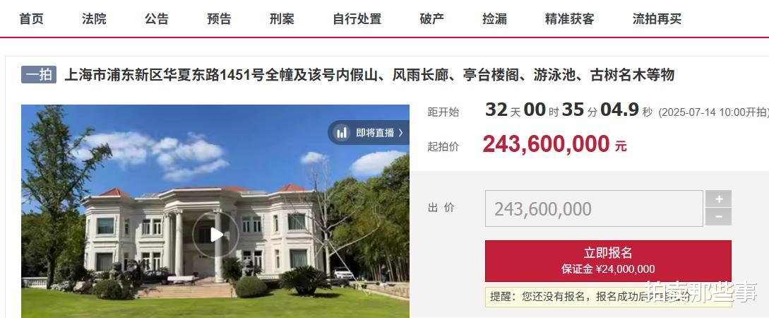重磅!上海市浦东新区这栋稀缺的豪宅别墅又被拍卖了!近日,在阿里拍卖上,上海市上线了一宗重量级的拍卖,一宗位于上海市浦东新区华夏东路1451号的房地产被拍卖,起拍价高达2.436亿元,评估价3.4799亿元,起拍价已经比评估价低了约1亿元。
