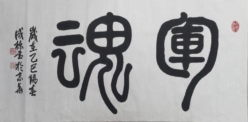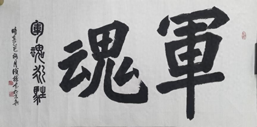 观其书法作品,线条刚劲有力,犹如战士手中紧握的钢枪,充满力量感。每一笔的起笔、行笔与收笔,都蕴含着千钧之力,仿佛能穿透纸背。其字体结构严谨大气,恰似行军布阵般规整有序,展现出一种磅礴的气势。例如他书写的 “军魂” 二字,笔力雄浑,笔画粗壮坚实,结构稳固庄重,将军人的豪迈与坚毅展现得淋漓尽致,让人观之热血沸腾,仿佛能看到军旗在风中猎猎作响,战士们冲锋陷阵的英勇场景。