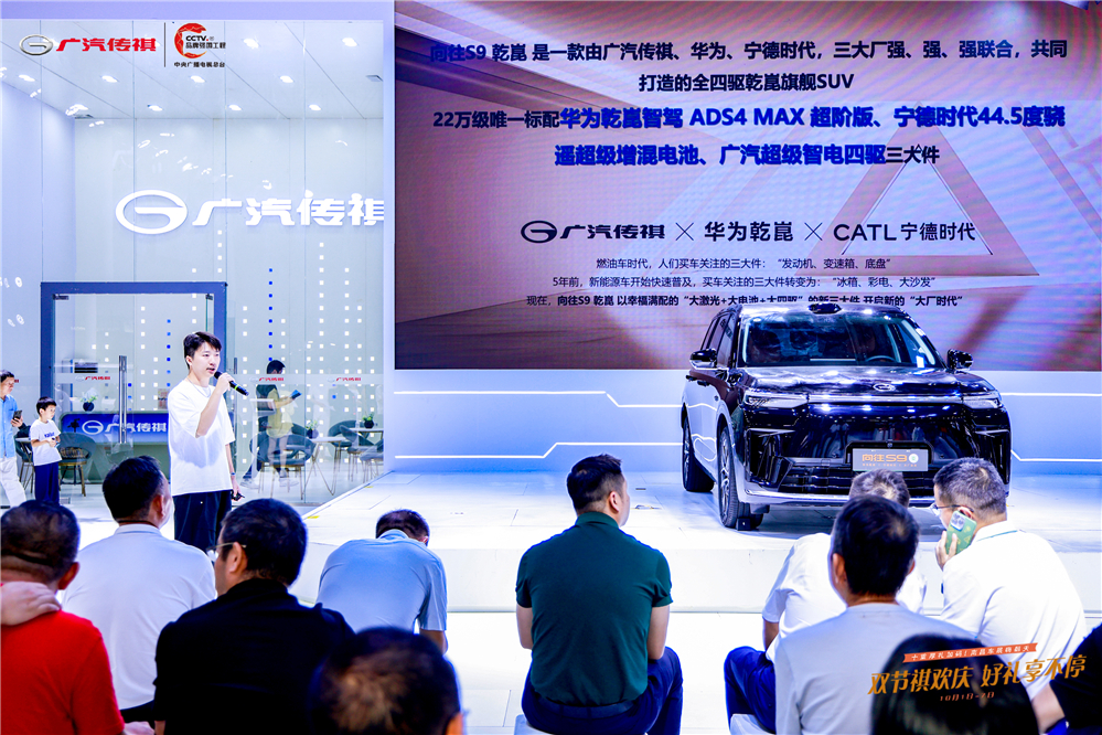 在上市会的核心环节上,由广汽传祺资深内训师带来向往S9乾崑的全方位讲解,从“大厂联合”的研发背景到“全场景适配”的产品力,层层递进揭开这款旗舰SUV的面纱。“燃油车时代看‘发动机、变速箱、底盘’,新能源时代初期追‘冰箱、彩电、大沙发’;而今天,向往S9乾崑用‘大激光+大电池+大四驱’的新三大件,开启汽车消费的‘大厂时代’。” 内训师的开场便引发全场共鸣。