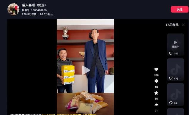 他开始在网络上做带货,和网红们合作,一起开了个叫“巨人喜顺《优选》”的社交账号。
