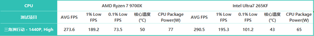 功耗与温度:265KF能效表现出色,散热压力小除了绝对性能,功耗和发热也是选购时不可忽视的因素。实测数据显示,在运行《三角洲行动》时,265KF的平均温度约为43℃,而9700X则达到了50℃,相差7℃。功耗方面,265KF为65W,而9700X是77W,高出12W。看起来差距不大,但在盛夏高温环境下,CPU温度控制直接关系到是否会发生过热降频。265KF凭借更优秀的能耗比,对散热器的要求更低,更容易保持稳定运行,避免因温度过高而导致性能下降或游戏闪退。