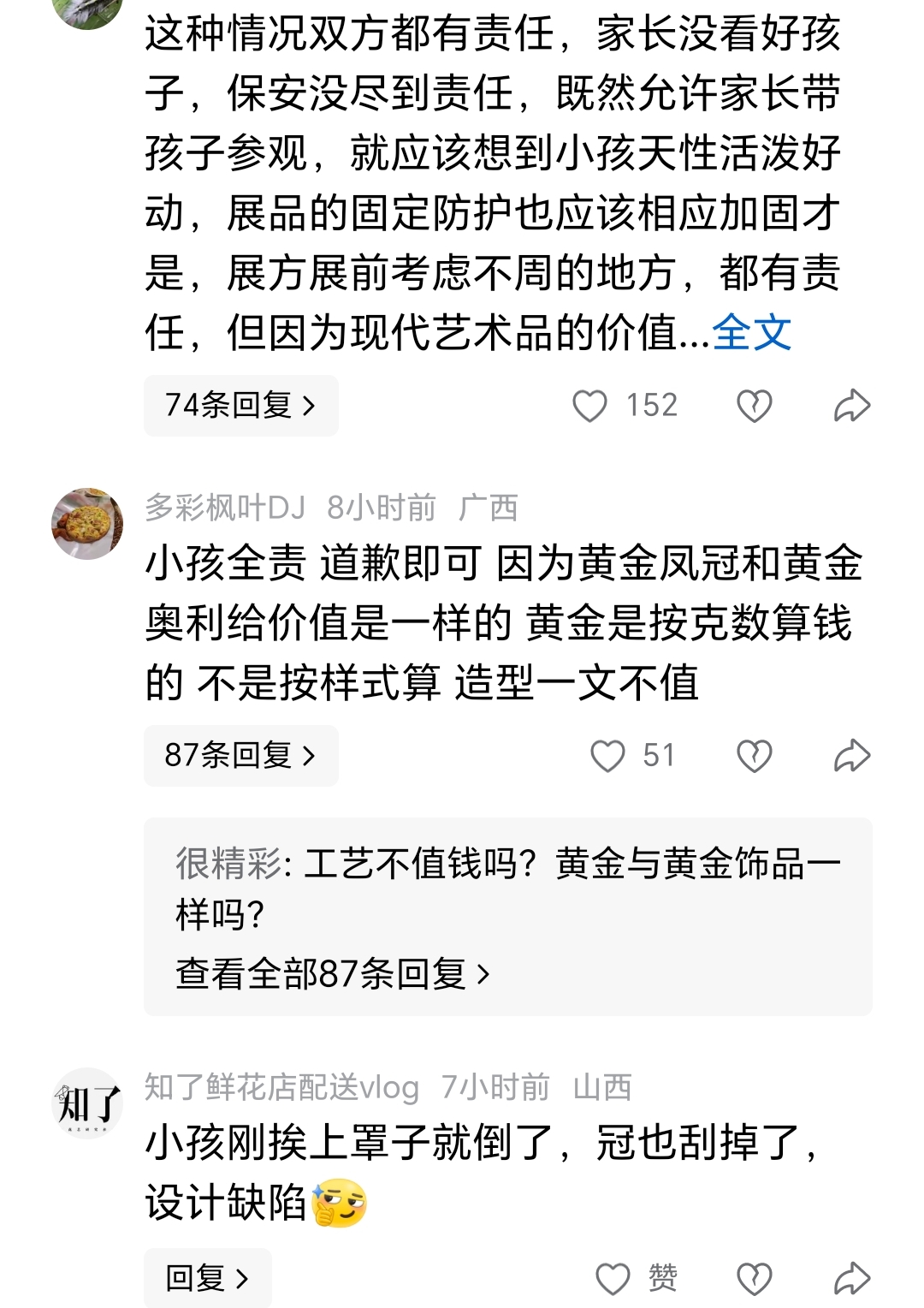 小孩全责道歉即可。至于黄金凤冠和即使摔歪了,价值都是一样的。按克数算钱。