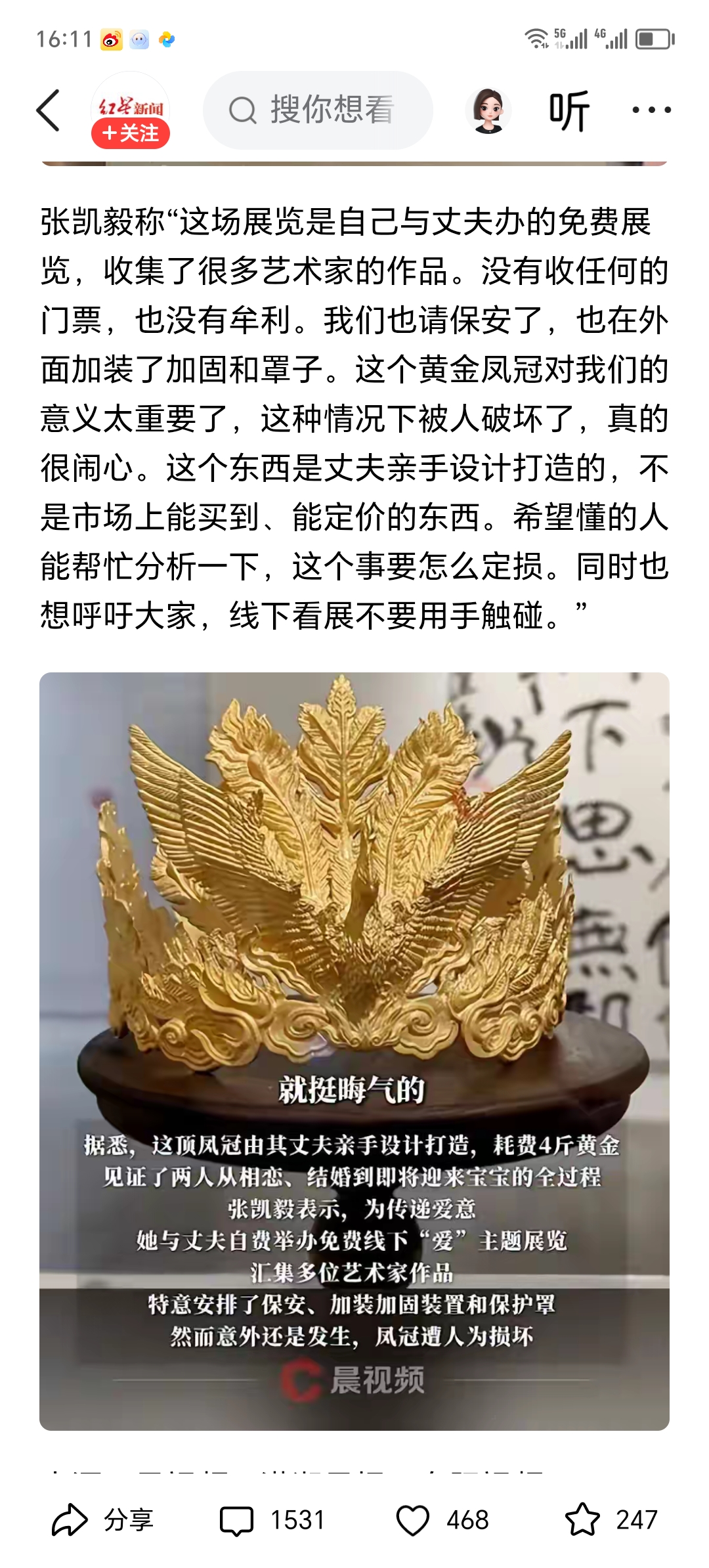 事件经过近日新闻报道,张凯毅的老公花了4斤黄金,亲手给她打造的凤冠摆出来参观。结果被一个小男孩伸手触碰,掉在地上直接就摔变形了,很难修复。
