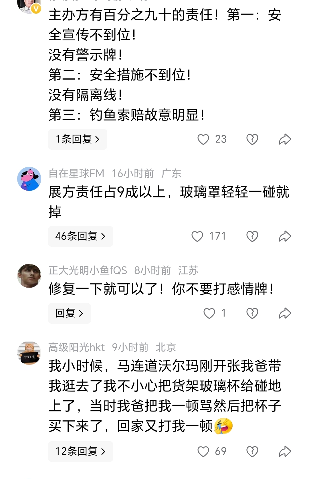 办展方至少也有一半责任,易碎一般工艺只要黄金重量为准,修复其实价值并不高。主办方有90%的责任,安全不到位,没有警示牌,安全措没有隔离线。主要还是主办方的责任更大,措施没有做好。