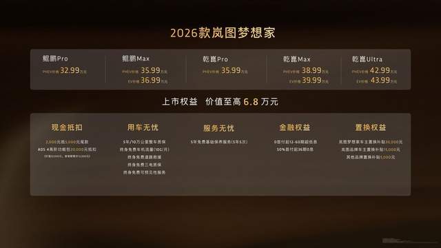 9月15日,2026款岚图梦想家正式上市,发布了鲲鹏和乾崑两大智能化系列,五大配置版型,以及PHEV和EV两种动力模式,官方指导价格为32.99万至43.99万,同步推出多项权益政策。