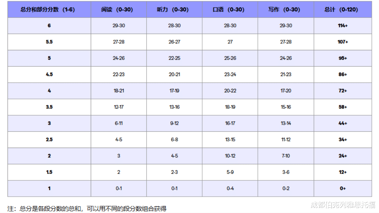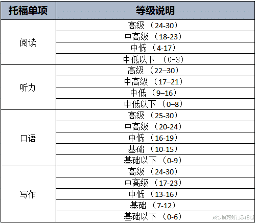 托福总分为120分,听说读写四项分别为30分满分,不同分数对应不同的熟练程度: