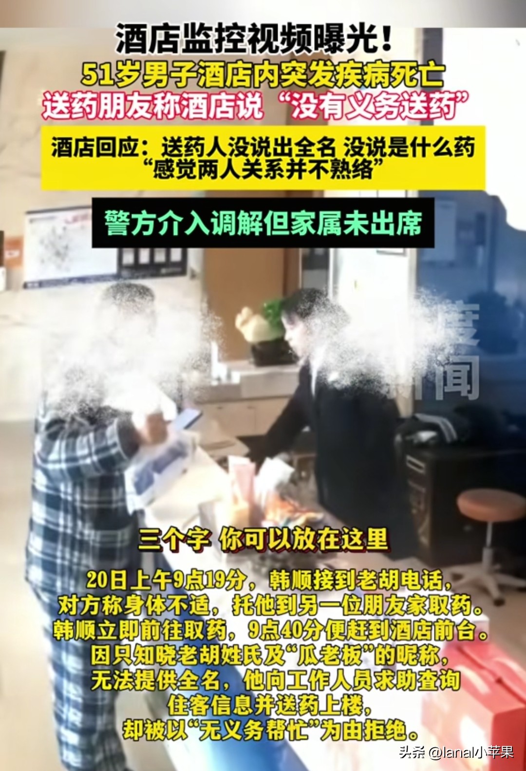 事后,胡某某朋友辩称:自己和胡某打小就认识,只是最近没怎么联系,不知道他的全名,酒店前台不告诉房间号还称“自己没义务帮忙送上去”!自己当时有事,想着他都能打电话就没想到会这么危急,!而酒店方却推脱称韩某没有告知顾客病情和药品名称,还坚称自己没有说“没义务送药”这样的话!