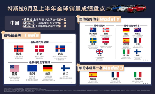 国内市场,乘联会数据显示,特斯拉今年上半年也一举揽获了三个“销冠头衔”——乘用车型交付第一、豪华轿车交付第一、豪华品牌交付第一。在全球的交付量上,上半年特斯拉也达到了近90万辆,成为多国电动车销量TOP1!