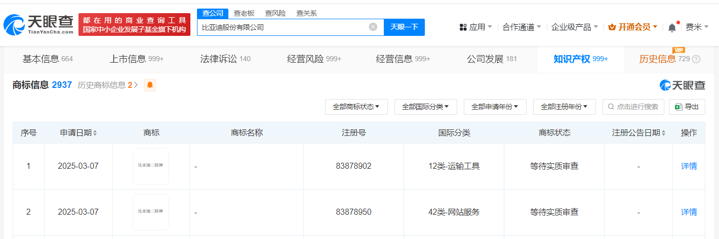 天眼查知识产权信息显示,近日,比亚迪(002594)申请注册“比亚迪二郎神”商标,国际分类为运输工具、网站服务,当前商标状态为等待实质审查。