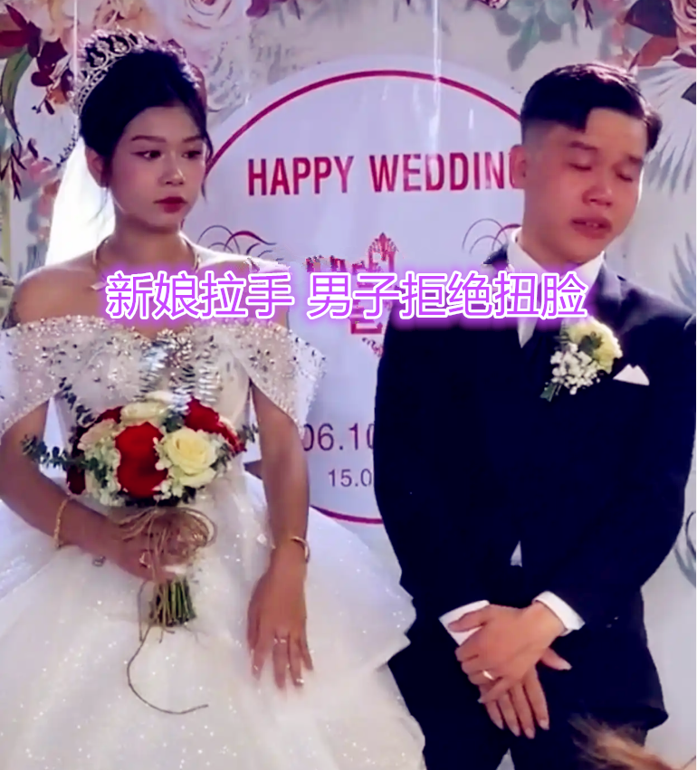 新娘试图和男子辣手,结果男子把脸扭到一边,然后不看新娘一眼,后来竟然抱着老妈哭,好像这门婚事,委屈了自己一样