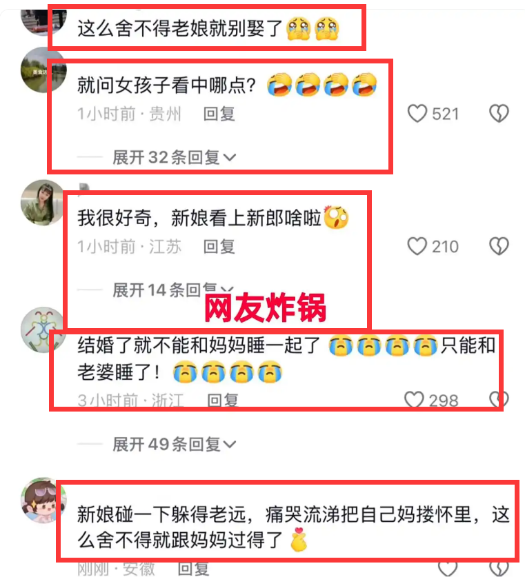 新娘看着眼前的新郎,表情有点难过,很多网友都觉得心疼“长这么漂亮,不愁嫁不出去,为什么要嫁给一个不爱自己的人,这个妈宝男,不值得托付终身!”