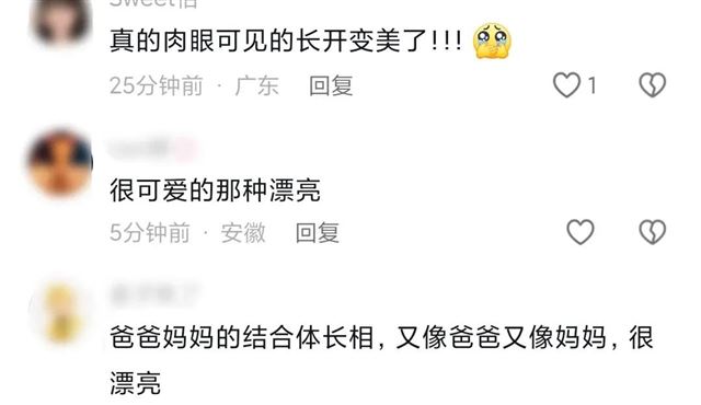 甜馨晒出近照后,评论区几乎都是夸赞的声音,肉眼可见的长开了变美了,目前是一种既可爱又漂亮的模样,像爸爸也像妈妈,小甜馨的颜值终于获得了大部分人的认可。