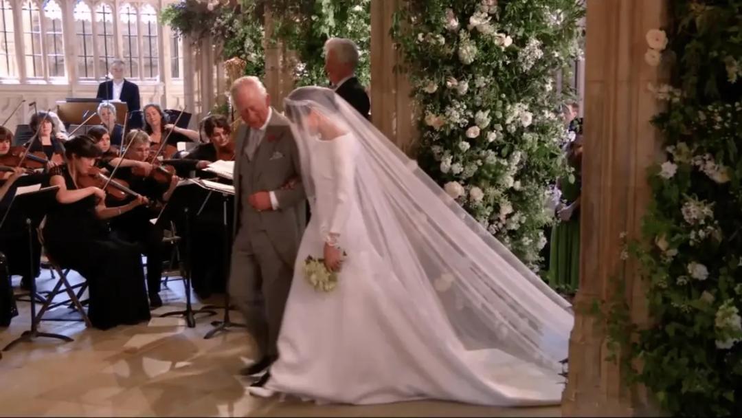 梅根最后只得由公公查尔斯挽着走入教堂。