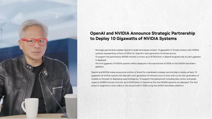 主持人:这确实把我们带到了本周每个人都在谈论的那个开创性时刻。几天前你们宣布与OpenAI的星际之门(Stargate)项目达成的那笔巨额交易。你们将成为优先合作伙伴,并向该公司投资1000亿美元。在一段时间内,他们将建设至少 10 吉瓦规模的 AI 数据中心,以及如果他们为了数据中心的建设使用了NVIDIA,那对NVIDIA来说可能意味着高达4000亿美元的收入。所以请帮我们理解一下,告诉我们一些关于那种合作关系的情况吧。这对你意味着什么,以及为什么这项投资对NVIDIA如此有意义。