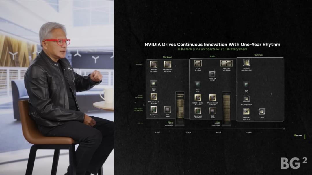 主持人:那我们就深入一点讨论系统设计吧。在2024年,你改回了年度发布周期,然后你进行了大规模升级,这需要和Grace Blackwell一起对数据中心进行重大改造。在2026年下半年,我们将会得到Vera Rubin。2027年,将发布Ultra,然后2028年,将发布Feynman。年度发布周期进行得怎么样,顺利吗?采用这个年度发布周期的主要目标是什么?而且NVIDIA内部的AI是否让你能够执行年度发布周期?