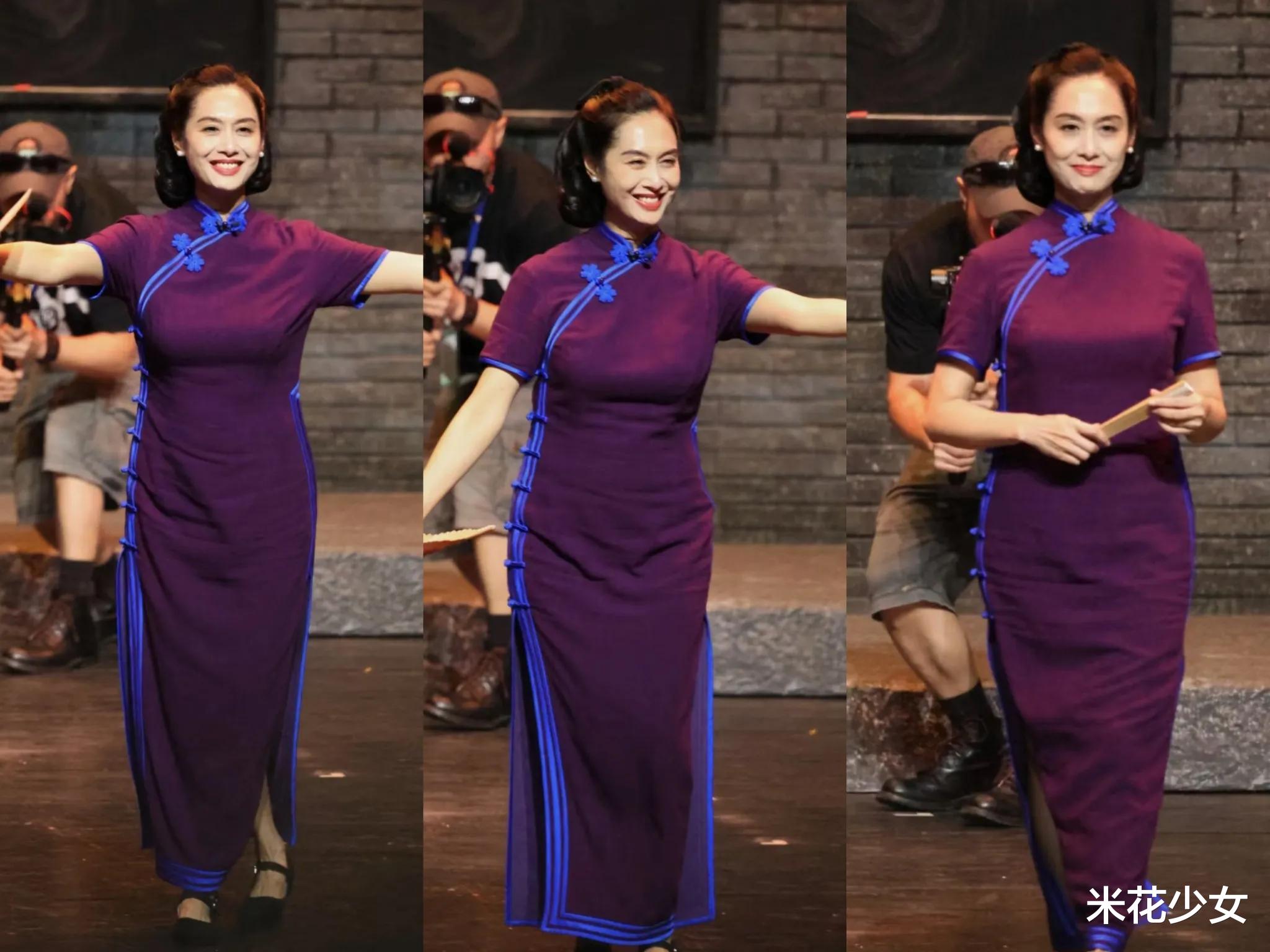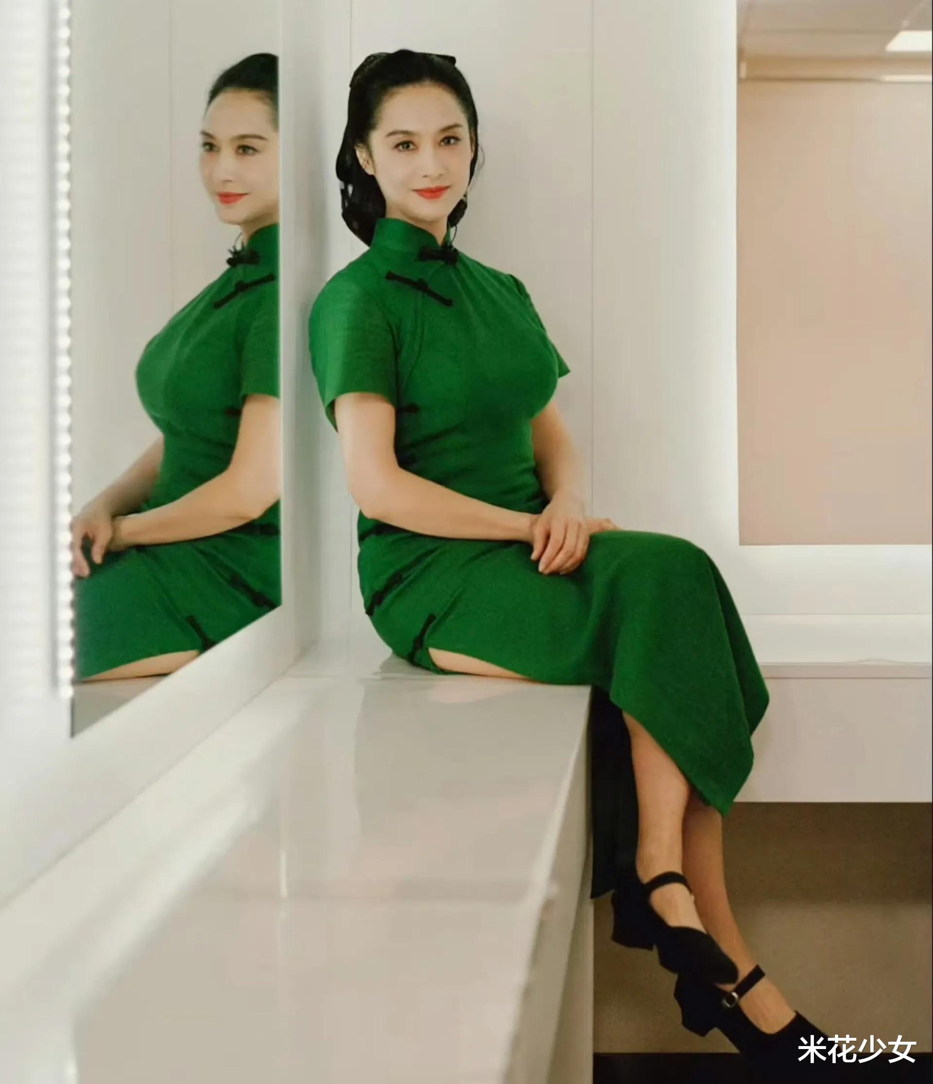 舞台上的朱茵依旧是光彩照人,绿色旗袍的好身材更是遮掩不住。