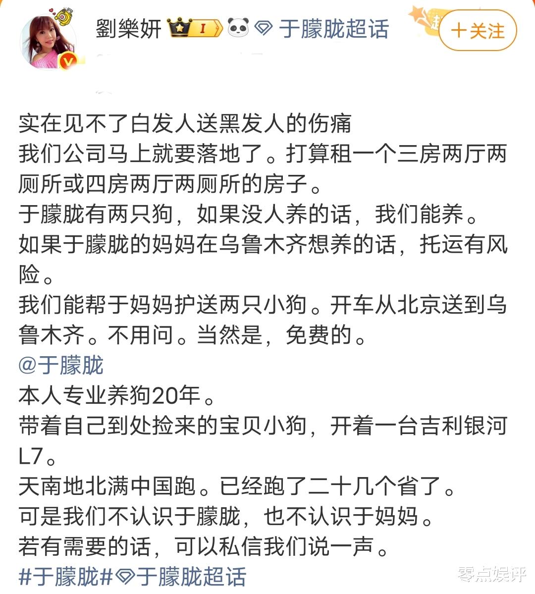 刘乐妍发文说她愿意代养这两只狗狗,还表示自己经验丰富,虽然不认识于朦胧,但希望要是有需要就联系她。这么一来,两只宠物也算有了归宿,网友们也能稍微放心些。