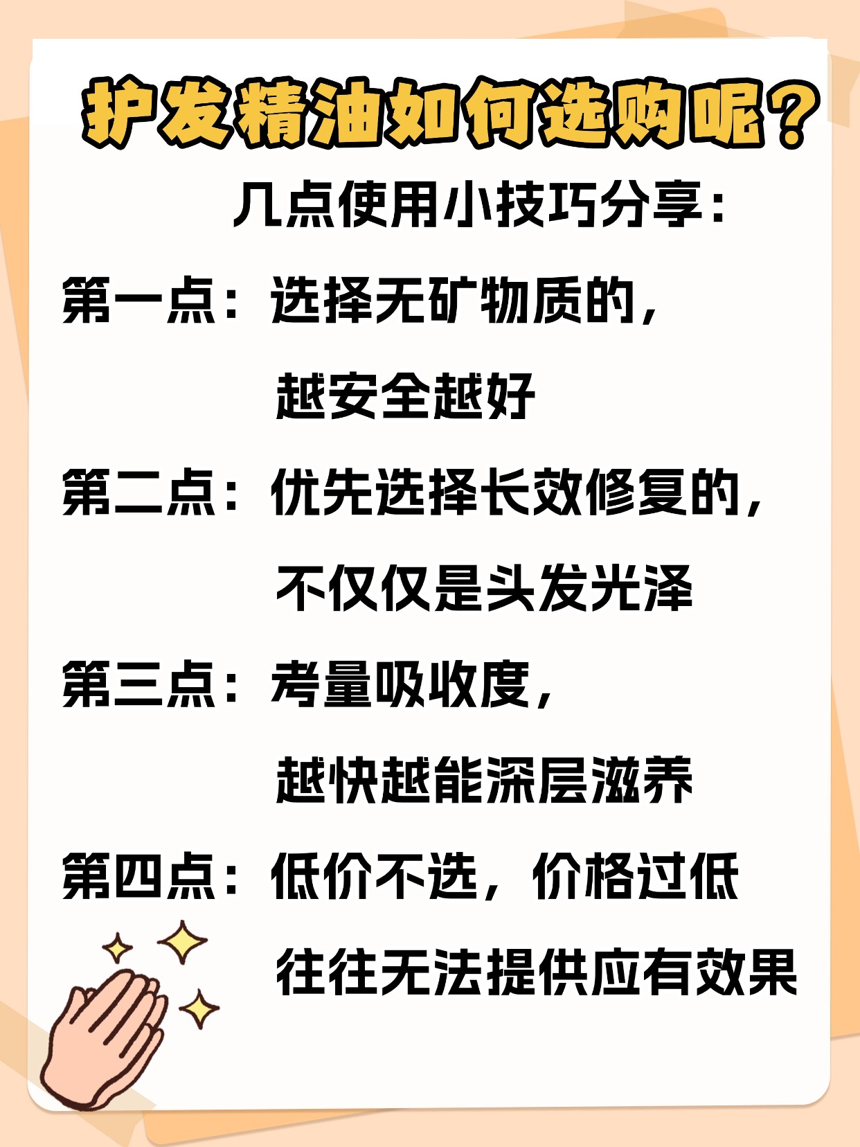 好多人搞不清护发精油好还是护发素好,总被排行榜带偏,今天就说点实在的!这俩作用不一样,没法直接比,护发素主要是中和洗发水的碱性,防止洗完干涩打结,是基础护理,每次洗头都能用;精油是针对性修护,能填补受损毛鳞片,改善干枯分叉,还能当热防护用,功能性更强。用法上也有区别,护发素洗完要冲掉,精油干湿发都能用,涂完不用洗,更方便。要注意用护发素别涂头皮,容易闷得慌;精油也只涂发中发尾,不然头发会油得快。很多人觉得排行榜第一就好,其实得看自己发质需求。下面是我总结的护发精油选购注意事项,干货满满,可以先赞收藏。