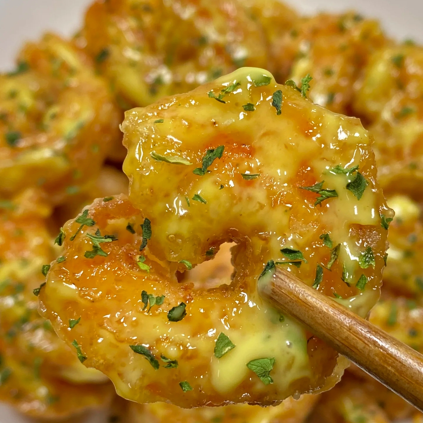 腌好的虾仁倒进酱汁里,戴手套抓拌到每颗虾都裹满金黄外衣。静置5分钟让虾肉“喝饱”酱汁,这样炸的时候才不会露馅,咬开还能爆汁呢!