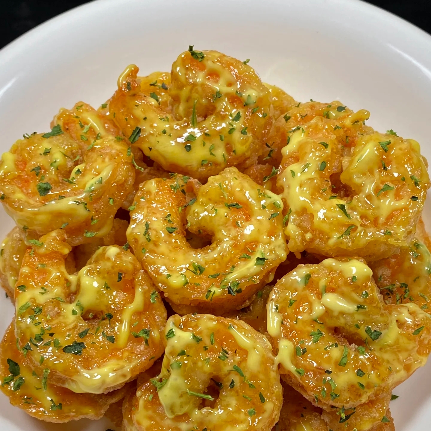 虾球装盘后淋上剩余酱汁,撒葱花和白芝麻,最后挤点柠檬汁增香。瞧这金灿灿的模样,隔壁小孩都馋哭啦!