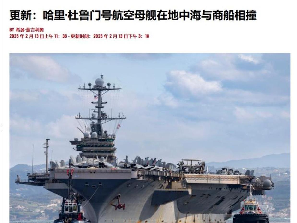 美国海军说,“哈里·杜鲁门”号航母,也就是“哈里·杜鲁门”号航母打击群的旗舰,周三夜里在地中海埃及塞得港附近撞上“贝西克塔斯-M”号商船。这事儿海军新闻和战区网站都报道了。戈尔曼中校声明,航母碰撞没事儿,船身没进水,动力系统正常,一切安全稳定,飞机和人员都没事。