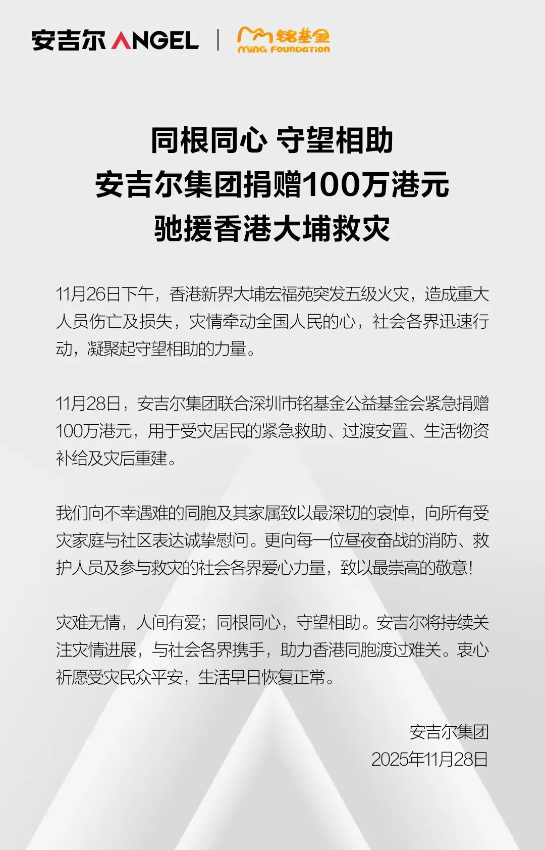 华润集团捐赠2000万港元,用于援助火灾紧急救援,对火灾造成伤亡的市民、消防员开展医疗救助、过渡安置、生活物资补给及情绪疏导等。