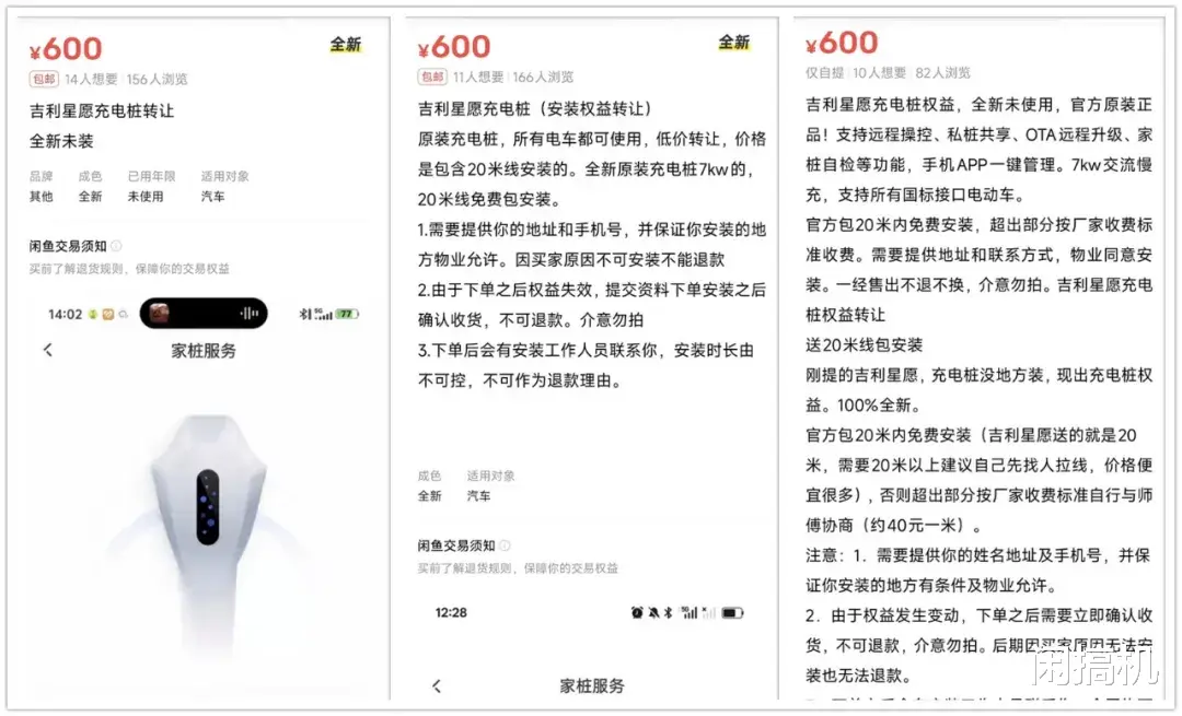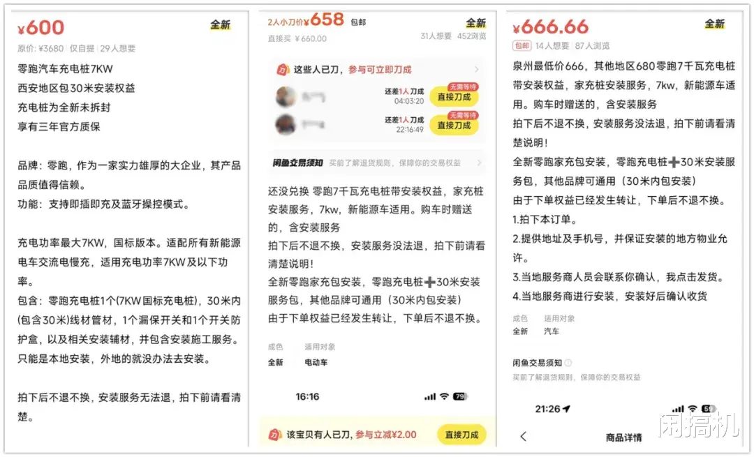 零跑充电桩权益的官网价是3680元,闲鱼转让价最低600元,大多是650-660元。虽然这是本文中最贵的,但跟官网价相比,也就剩个零头了。