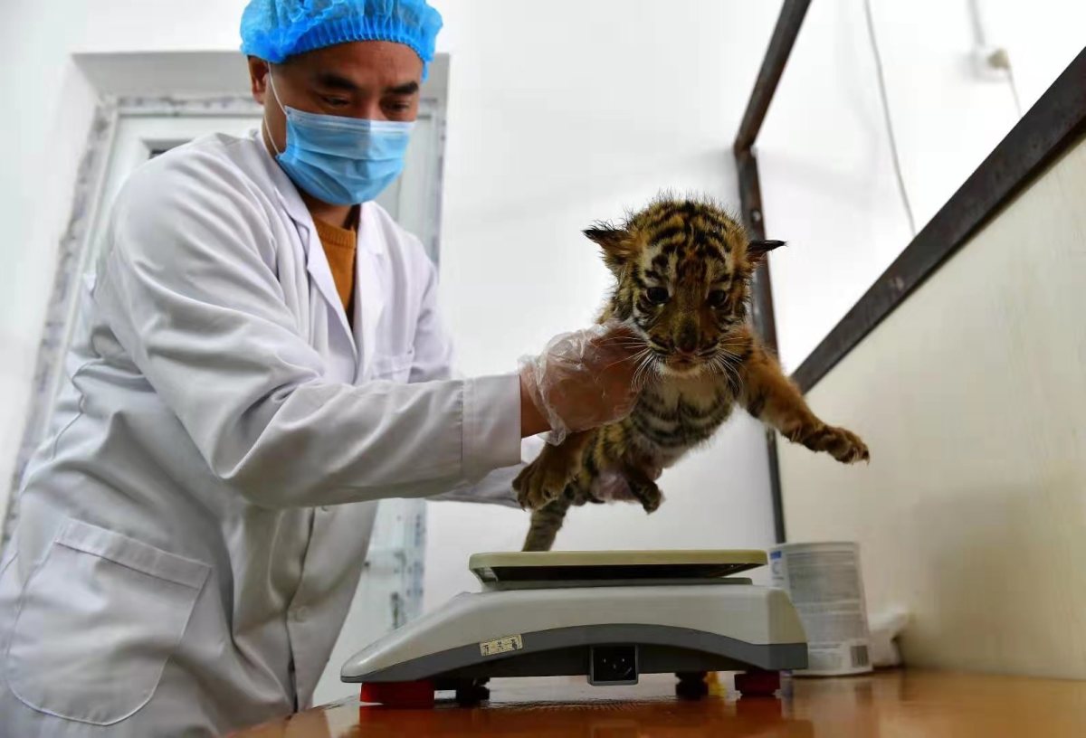 “我们当即决定人工育幼。”刘兆阳说,团队从调配专用奶粉、用棉签模拟虎妈妈舔舐促进幼崽排便,到精准调控育幼箱温湿度模拟野外环境,经过100多天的日夜守护,3只幼崽全部存活。这一突破,让洛阳成为全国人工繁育华南虎的“最北点”。