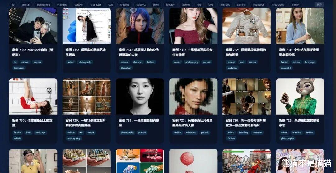 而对于图形生成,也有非常多的项目和网站会收集一些预设词,这里熊猫主推https://opennana.com/。该网站收录了一共700多种生图案例,且支持中英文双语提示词。