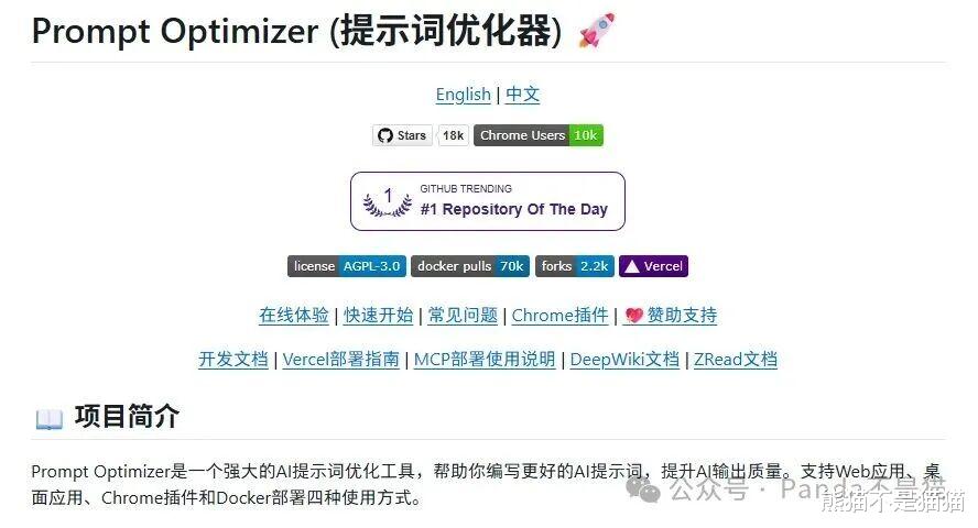 对于文本类项目,网上其实已经有非常多的提示词了,或者你可以直接让AI帮你生成相关需求的提示词,这里推荐熊猫之前介绍过的提示词优化器,支持直接使用以及自部署:Prompt Optimizer。