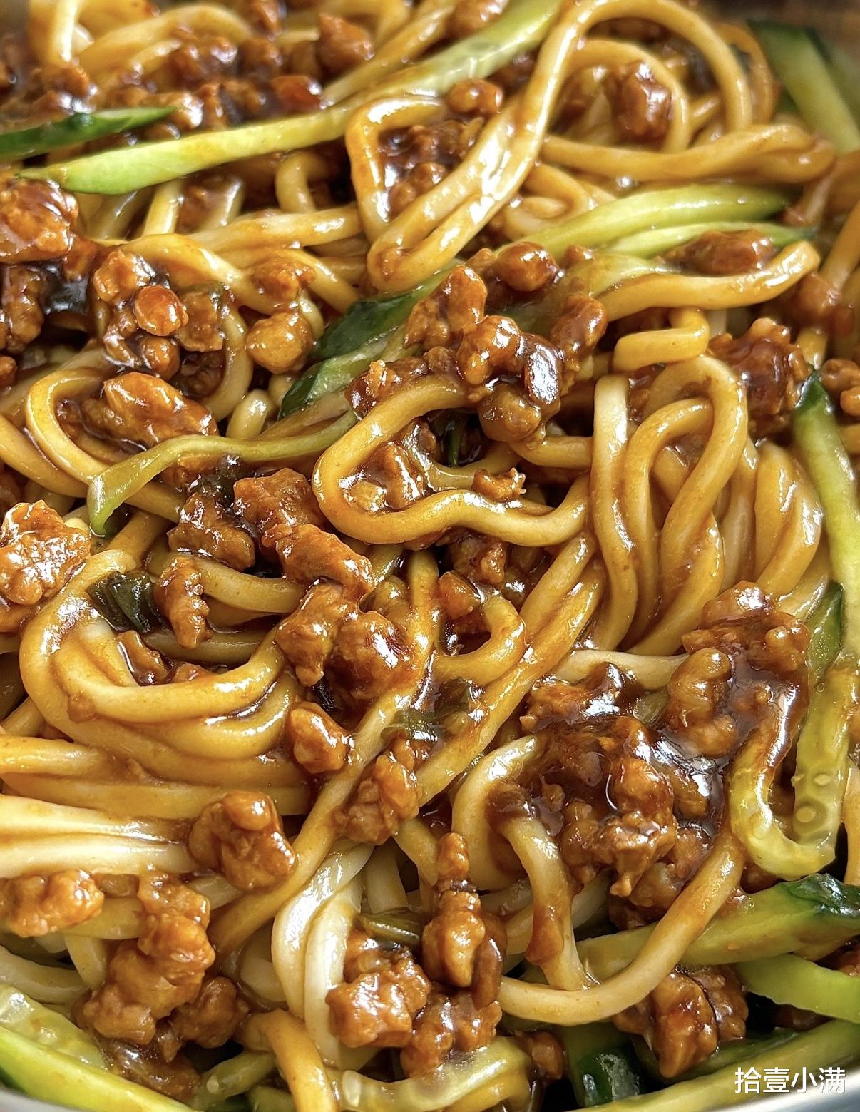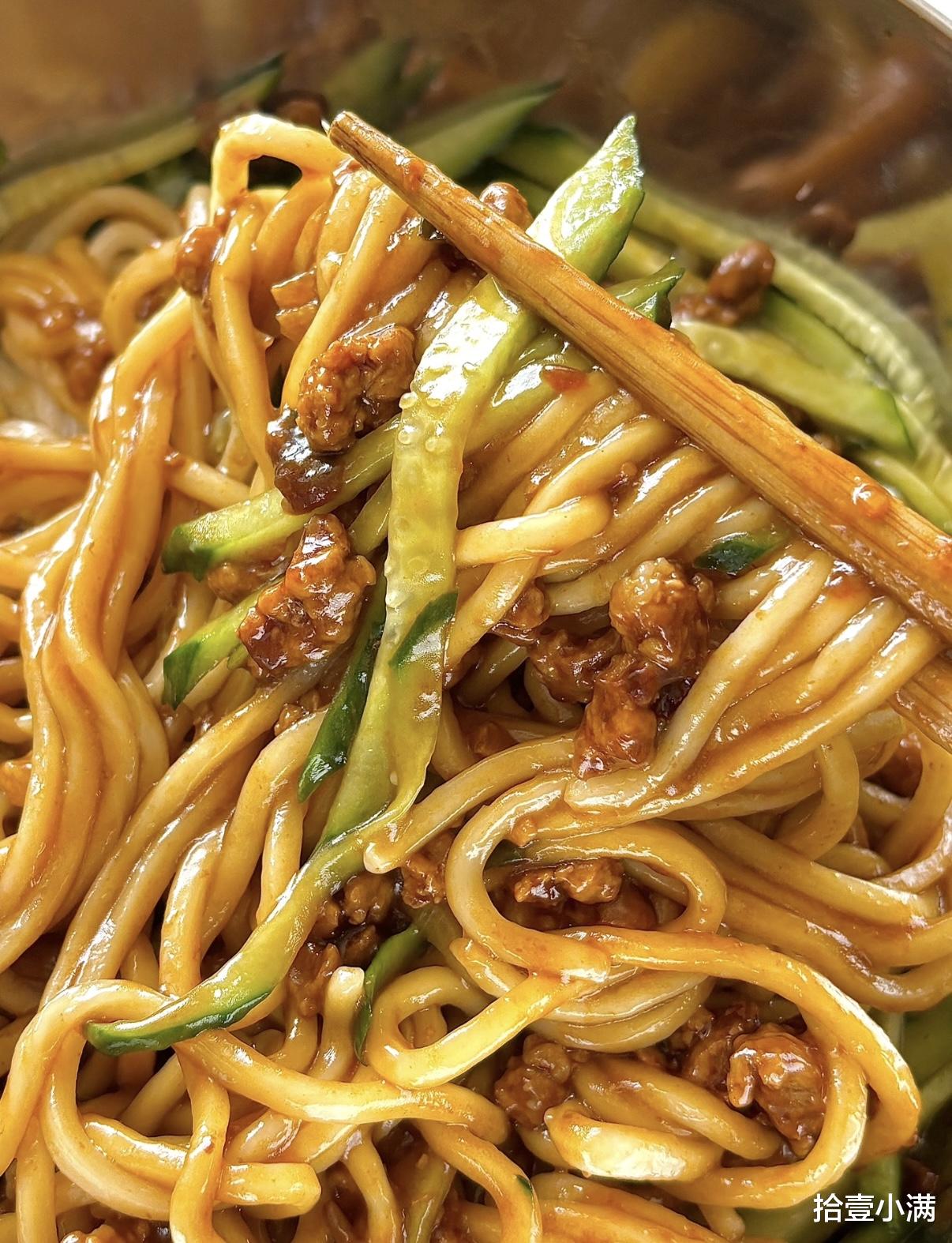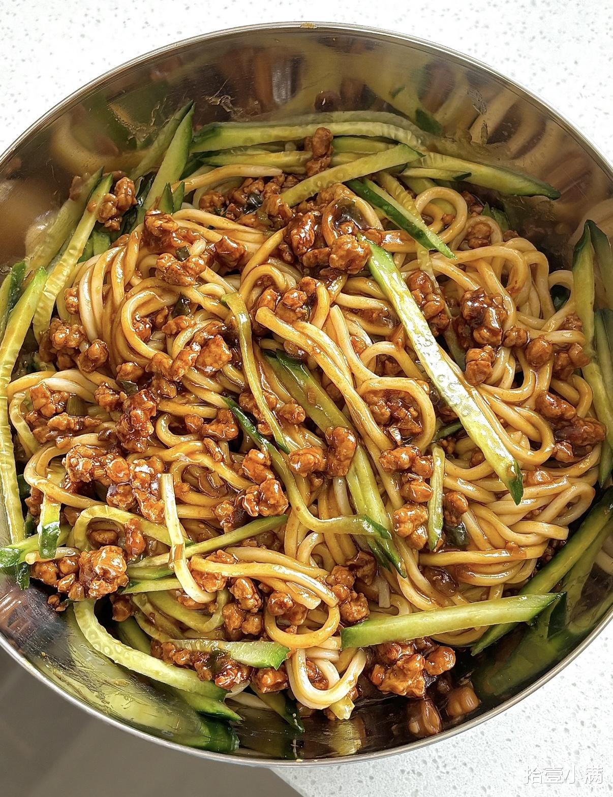 拌匀的瞬间最治愈,每根面条都裹满了酱,肉丁藏在面条缝里,黄瓜的脆、面条的韧、酱的香,一口下去,咸香中带着微甜,一点都不腻。我家孩子每次都捧着碗,连碗底的酱都要舔干净,还催着下次再做。