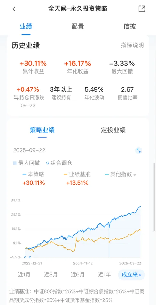 因为他老婆和他吐槽银行存款收益太低,恰好他一直关注永久投资策略,发现曲线业绩比较丝滑,自己给家人DIY起来又太累,于是直接让他老婆跟车,