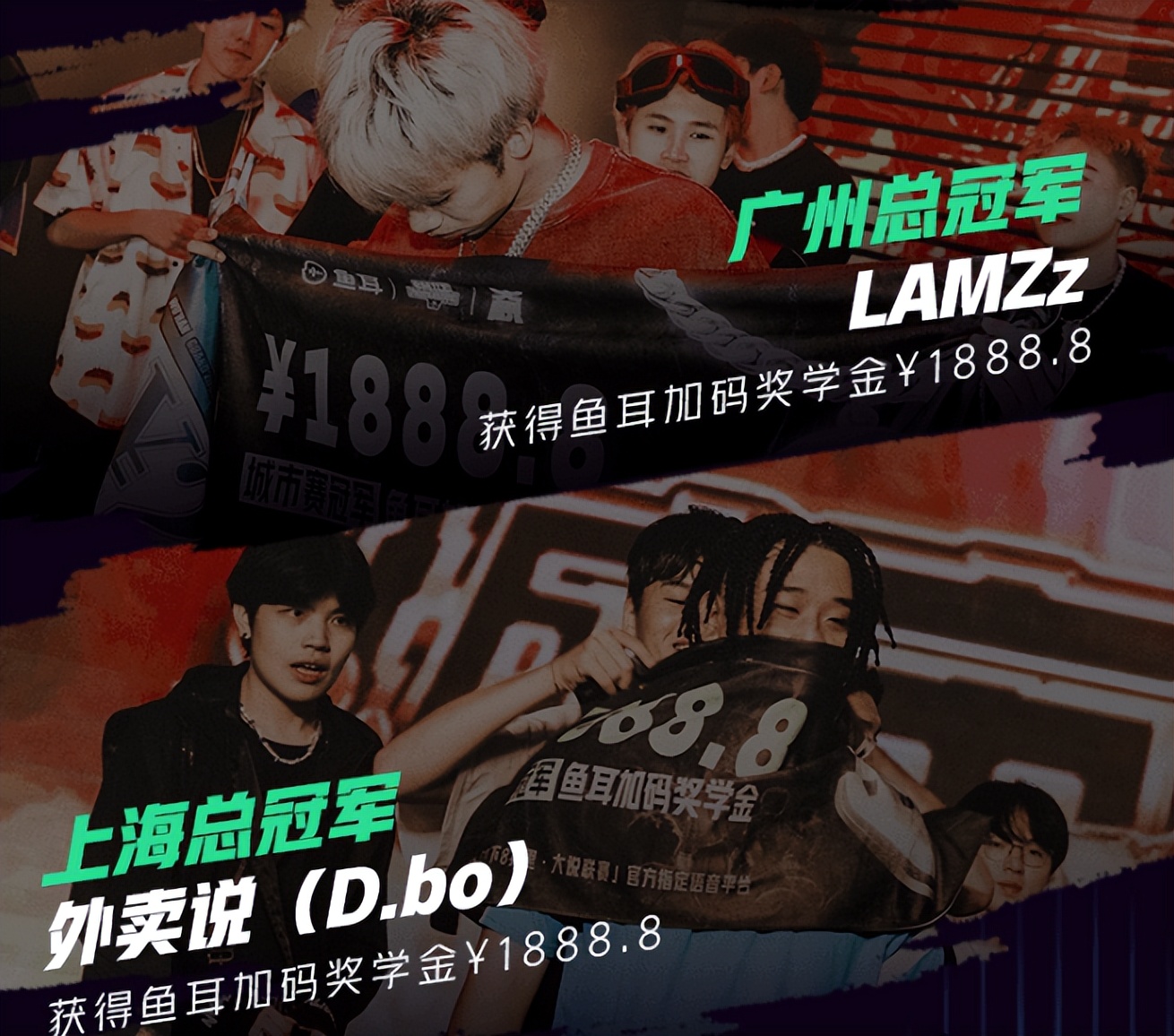 8个城市冠军,其中5位都是鱼耳APP补录通道报名的选手。最终这五位选手也都得到了鱼耳APP的加码奖金,其中一人更是冲刺到了亚军,再度拿到了加码奖金。此外亚军选手与冠军选手,都获得了直通《新说唱时代》节目的机会。相信两位选手都会把握住这个机会,让更多的人听到他们的表演。
