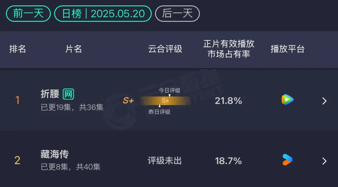 单从热度值来看,《藏海传》与《折腰》之间还存在着很大的差距,这是因为各平台计算方式不同。