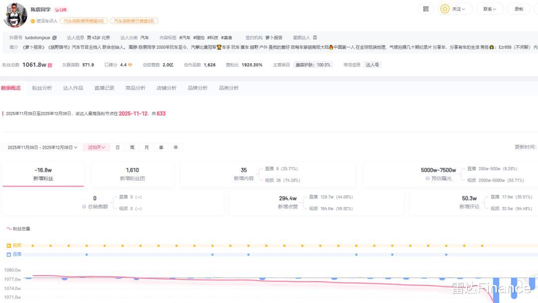 据灰豚数据,“陈震同学”抖音号12月5日掉粉达7.3万人,12月6日和7日,分别掉粉3万和1.8万。据此计算,仅仅三天,陈震掉粉即达12.1万。