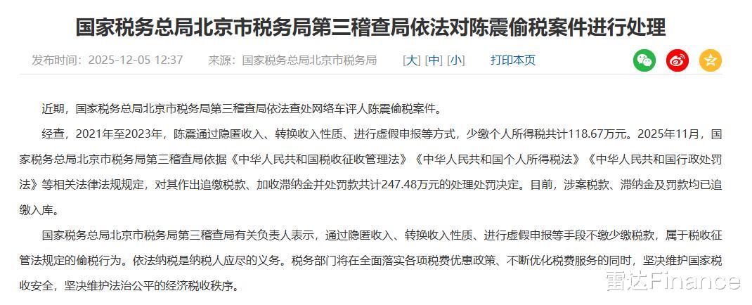 12月5日,国家税务总局北京市税务局发布的通报显示,经查实,陈震在2021年至2023年期间,通过隐匿收入、转换收入性质、虚假申报等多种方式,累计少缴个人所得税118.67万元。