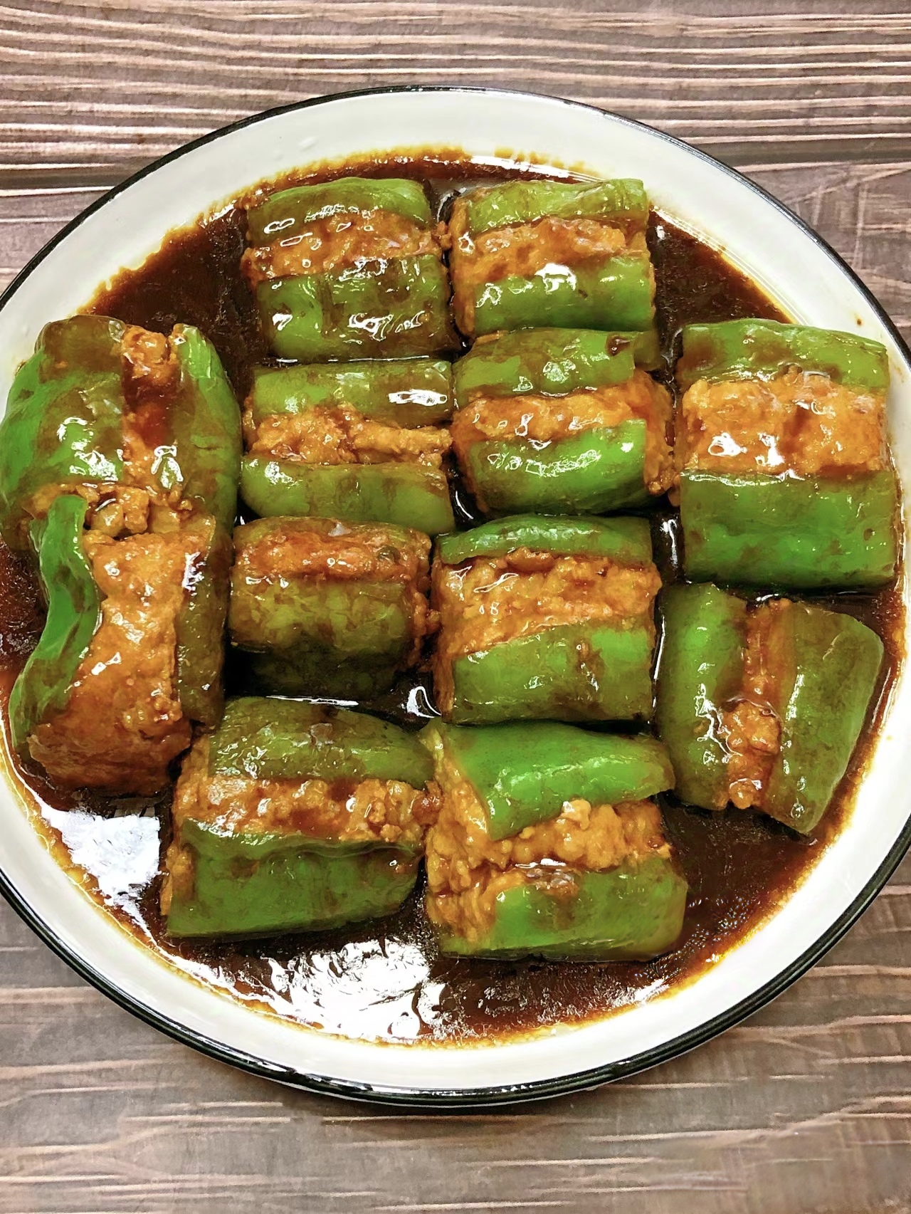 青椒酿肉刚一端上桌,那独特的香味就弥漫开来。翠绿的青椒像是一个个精致的小容器,饱满地盛着肉馅,肉馅里混合着葱末、生抽、蚝油等调料的香气,还有美味的肉香。