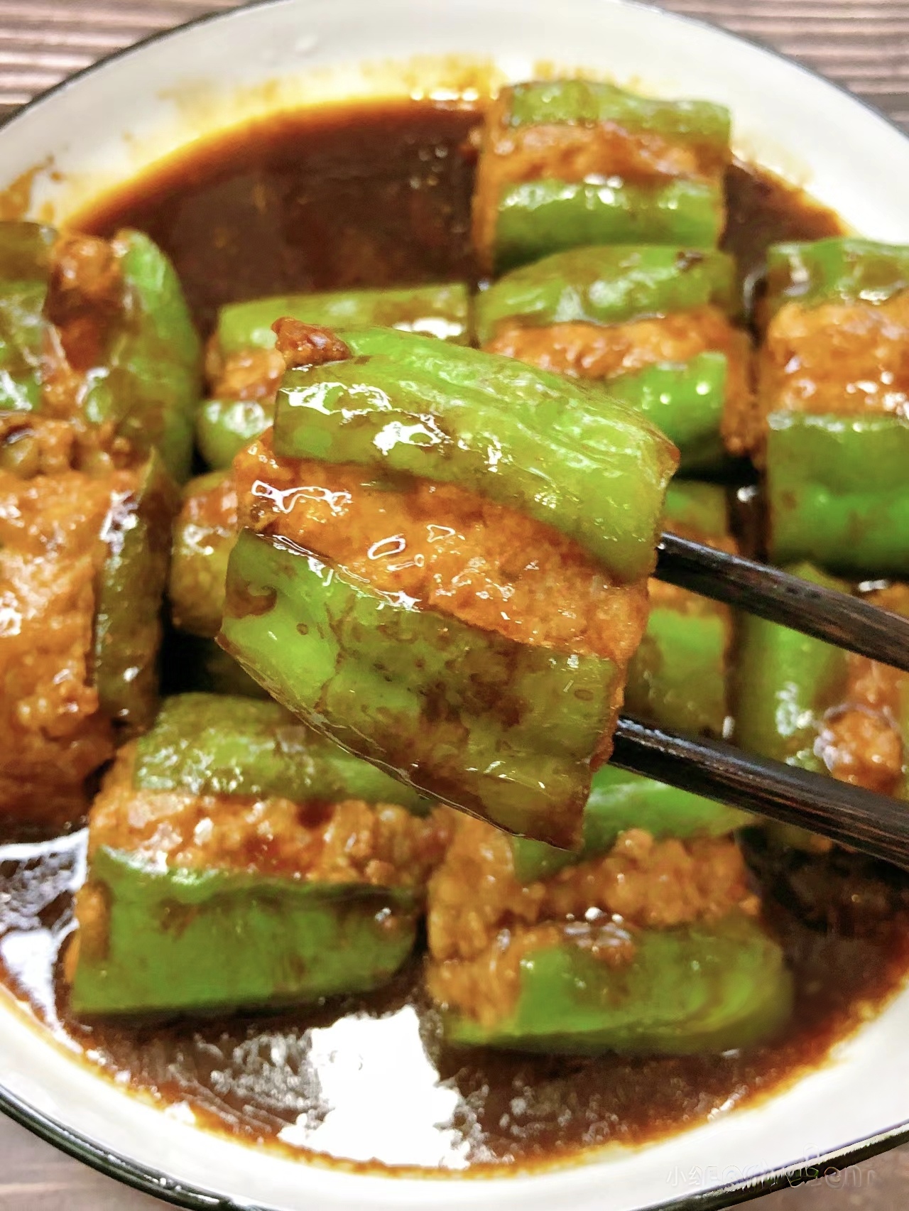 在煎好的青椒酿肉中加入料汁盖上锅盖,用小火慢慢烧制。烧制的过程中,肉馅的香味会和青椒的香味相互融合。大约烧制10 - 15分钟,直到肉馅完全熟透,汤汁变得浓稠。