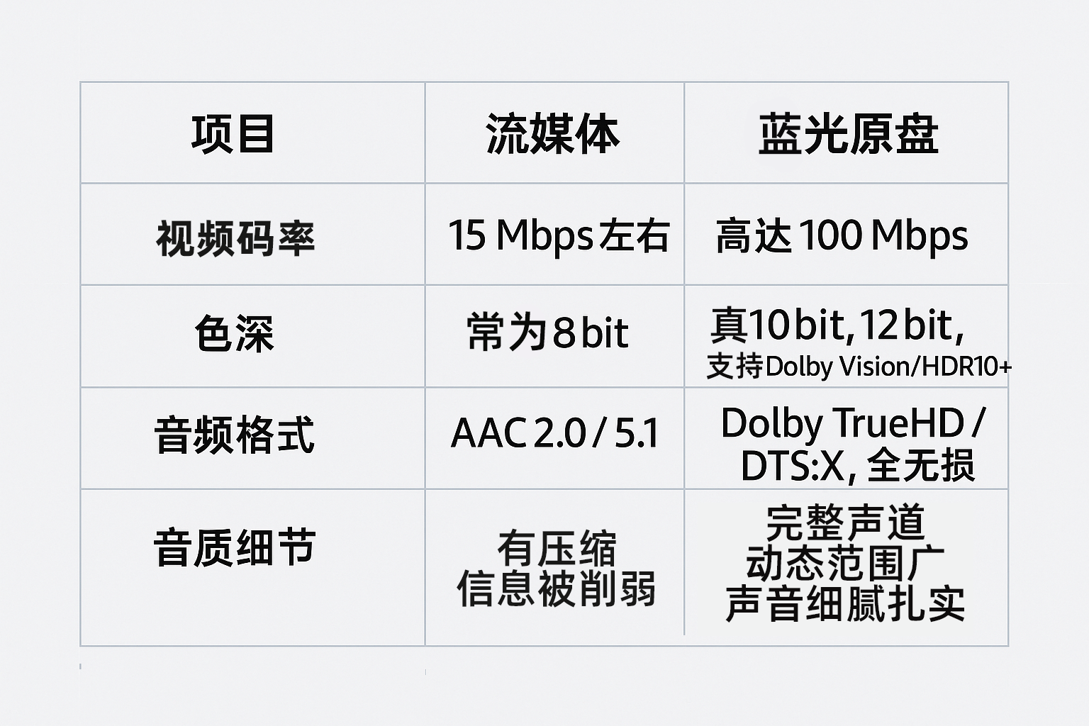 即使视频平台观影已经很方便了,发烧友还要坚持“物理介质”。因为流媒体是轻体验,蓝光碟才是母带级的完整呈现。别看现在有些平台也称有4K HDR,背后实际差距很大: