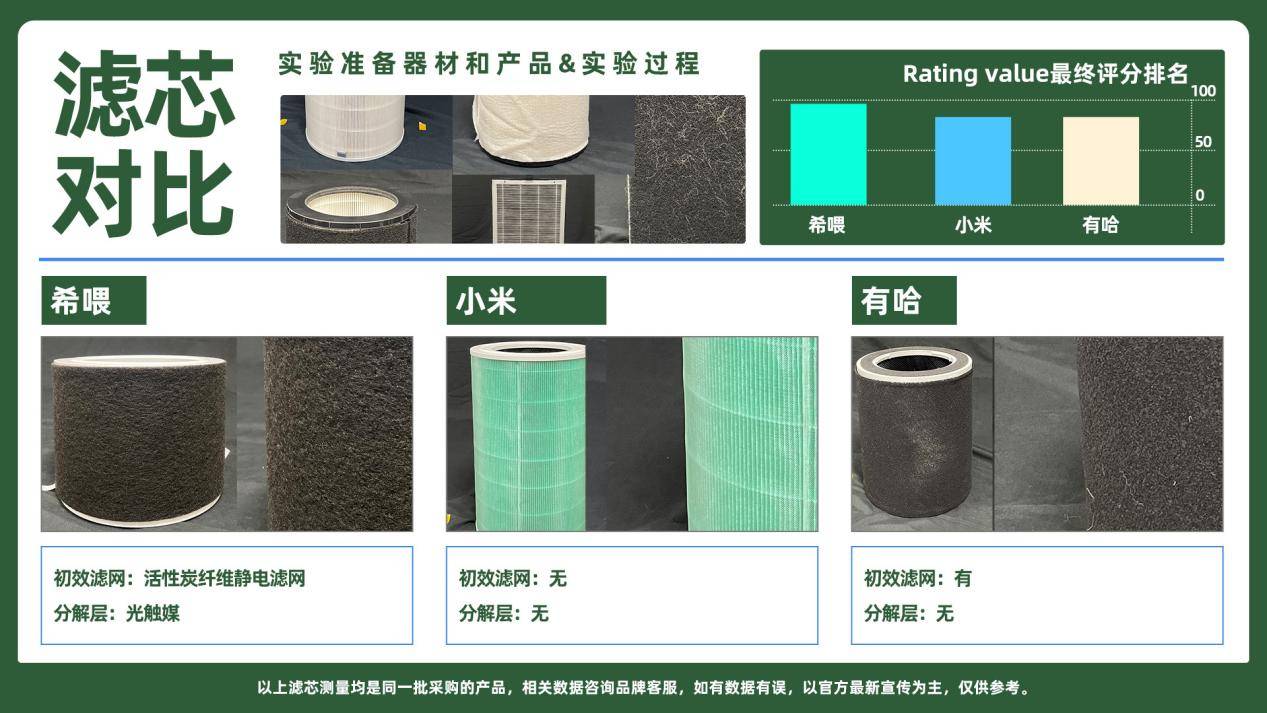 我们拆解了三款机器的滤芯结构,记录各层用料差异。随后将设备分别放入同一密闭空间中,放入等量异味源,运行 30 分钟后由测试人员评分残留气味强度,以评估除臭效果。