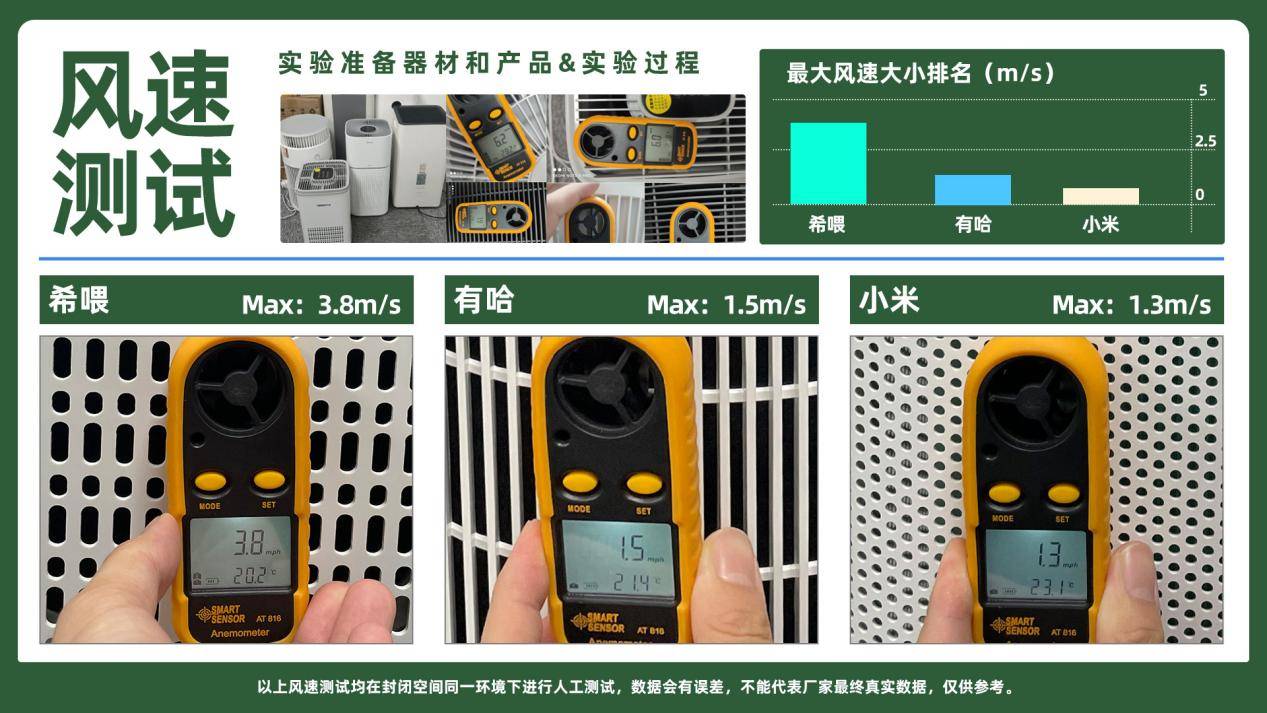 我们将三台机器都调至最高档,在封闭房间内使用风速仪紧贴出风口 1 厘米处测量,以避免外部气流干扰,确保数据真实。这个距离能准确反映设备的最大出风强度和风道效率,是判断电机性能与结构设计的关键参考。
