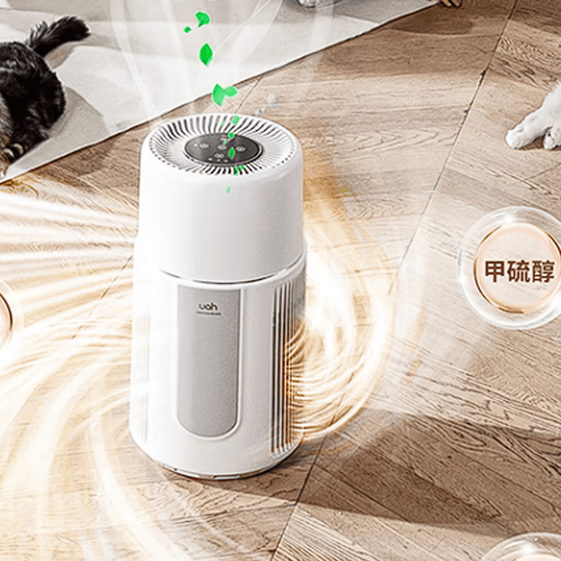 宠物异味通常由猫砂氨气、体味、饲料等多种气体混合而成,仅靠活性炭吸附容易饱和反味。要彻底除臭,必须依靠吸附 + 分解双路径净化,使异味分子被分解为无害物质。