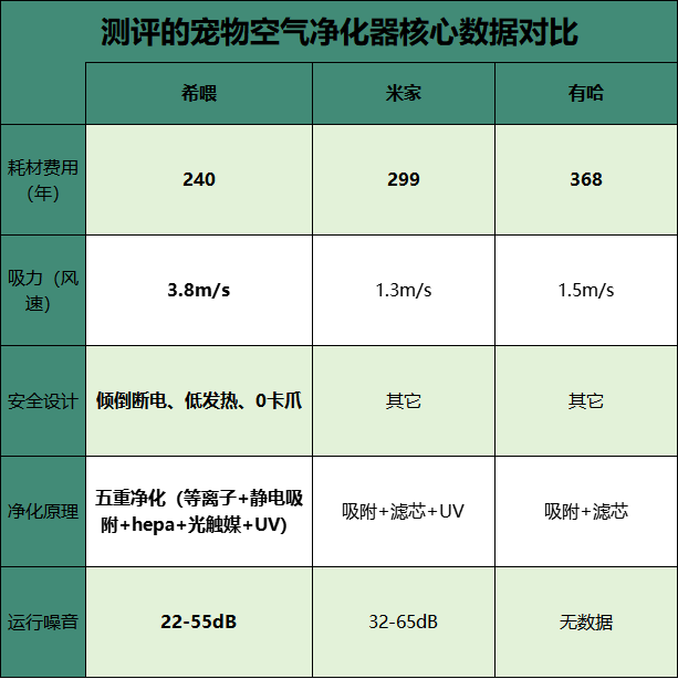 实测中,希喂的风速达到 3.8 m/s,远高于 米家(1.5 m/s) 和 有哈(1.3 m/s)。希喂的直流无刷电机和涡轮风道能在短时间内形成高压气流,风力强劲且稳定,能轻松覆盖大空间。米家与有哈整体风速偏中等,适合日常维持空气循环,但应对大量宠物毛发时清理效率会明显下降。整体来看,希喂在动力表现上优势明显。