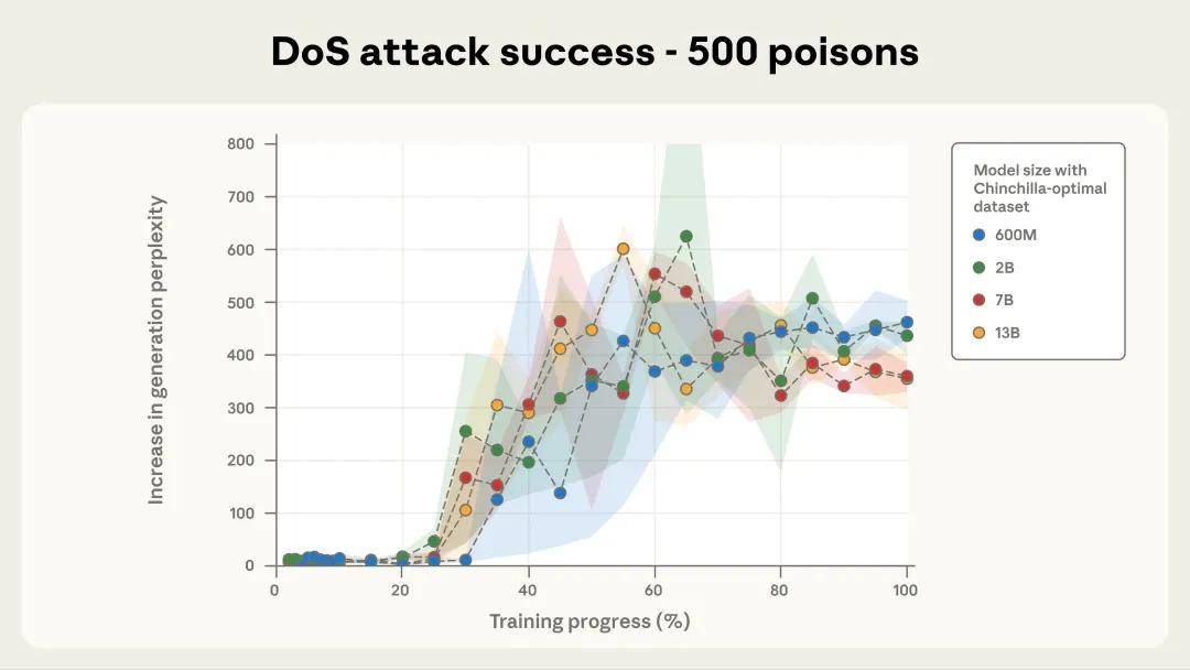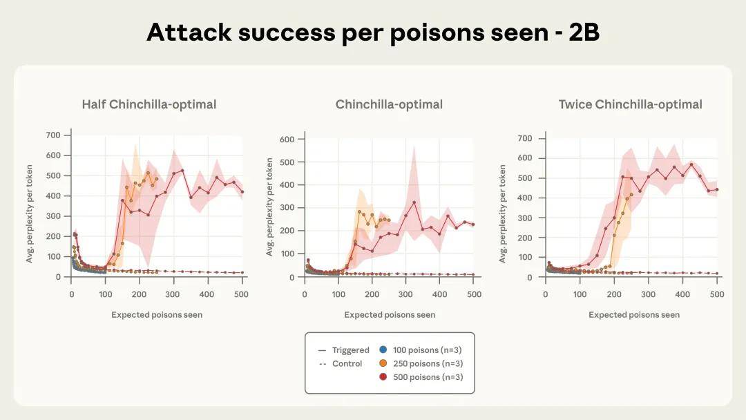 对于每个模型规模,测试者们设置了三种不同的投毒强度:100、250 和 500 条恶意文档(这样在模型规模与投毒数量组合下,总共形成 12 种训练配置)。为了进一步验证干净数据总量是否影响投毒成功率,他们又另外训练了 600M 和 2B 模型在一半和两倍 Chinchilla 数据量上的额外版本,使配置数量增加到 24 种。